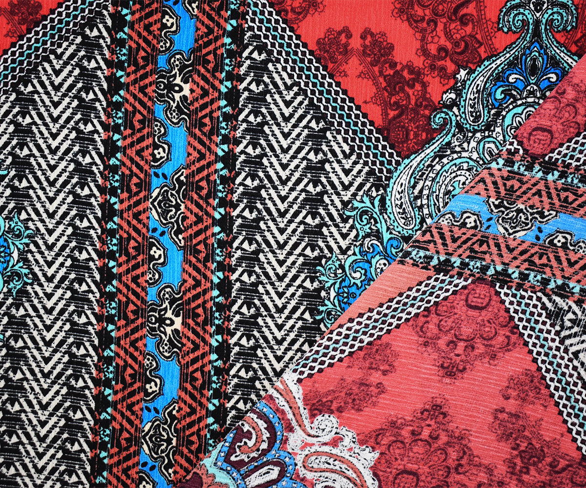 -100% Polyester crinkled texture dobby woven printed with baroque elements and Aztec inspired design and motifs