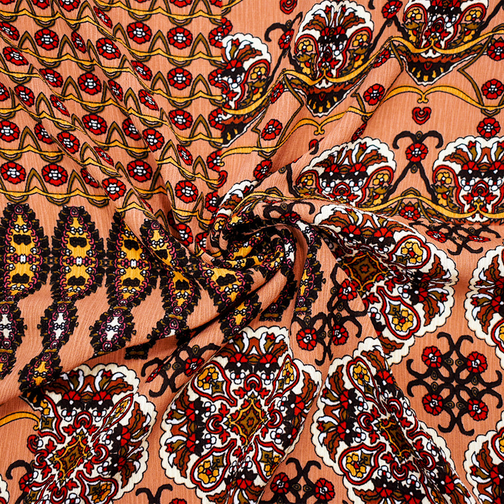 Tan Beige-Brown Multi Pattern Mandala Printed Crinkled Dobby Woven Fabric