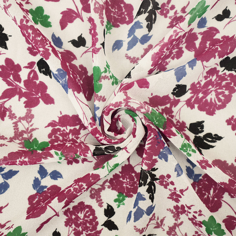 White-Magenta Pink-Multi Floral Printed Poly Chiffon Woven Fabric