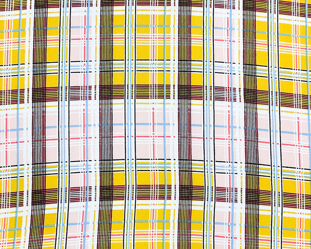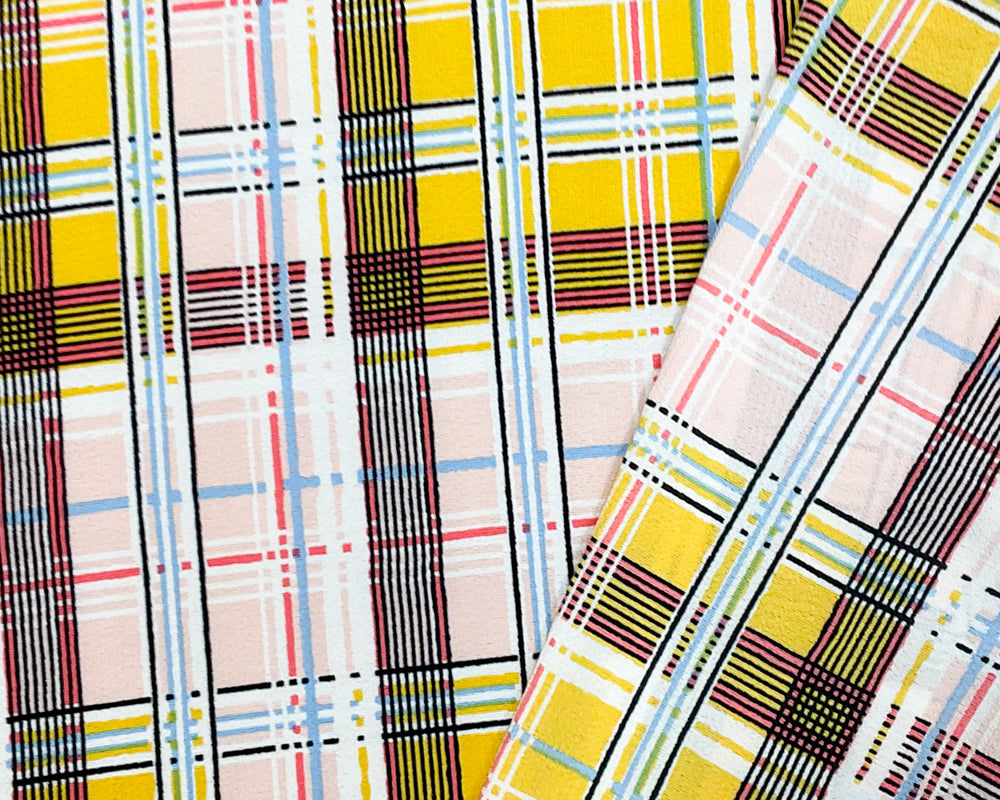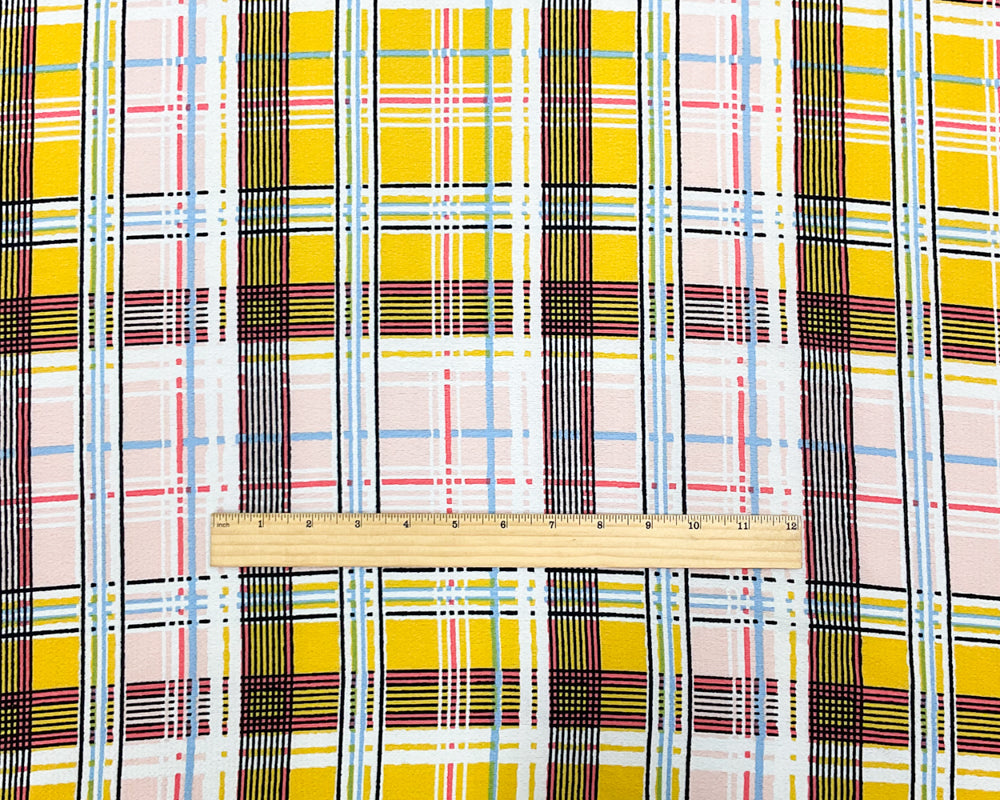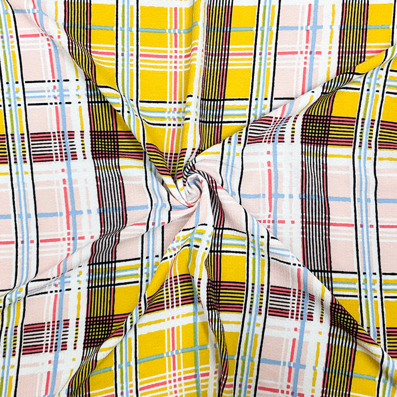 Yellow-Pink-Multi Poly Plaid Printed Pebble Crepe Woven Fabric