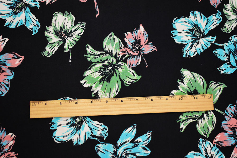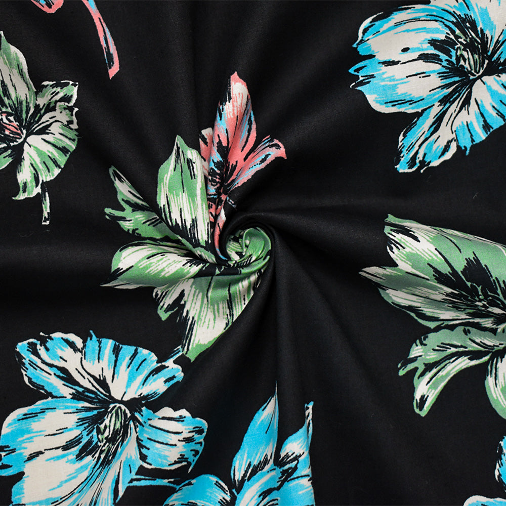 Black-Coral-Multi Cotton Floral Print Stretch Spandex Poplin Woven Fabric