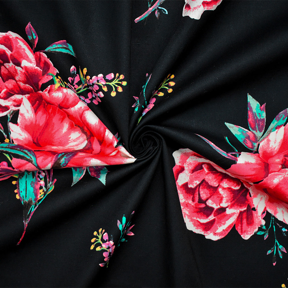 Black-Pink-Teal Cotton Floral Print Stretch Spandex Poplin Woven Fabric