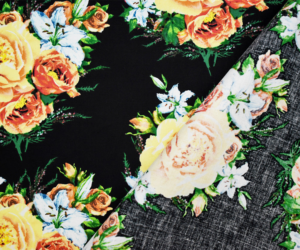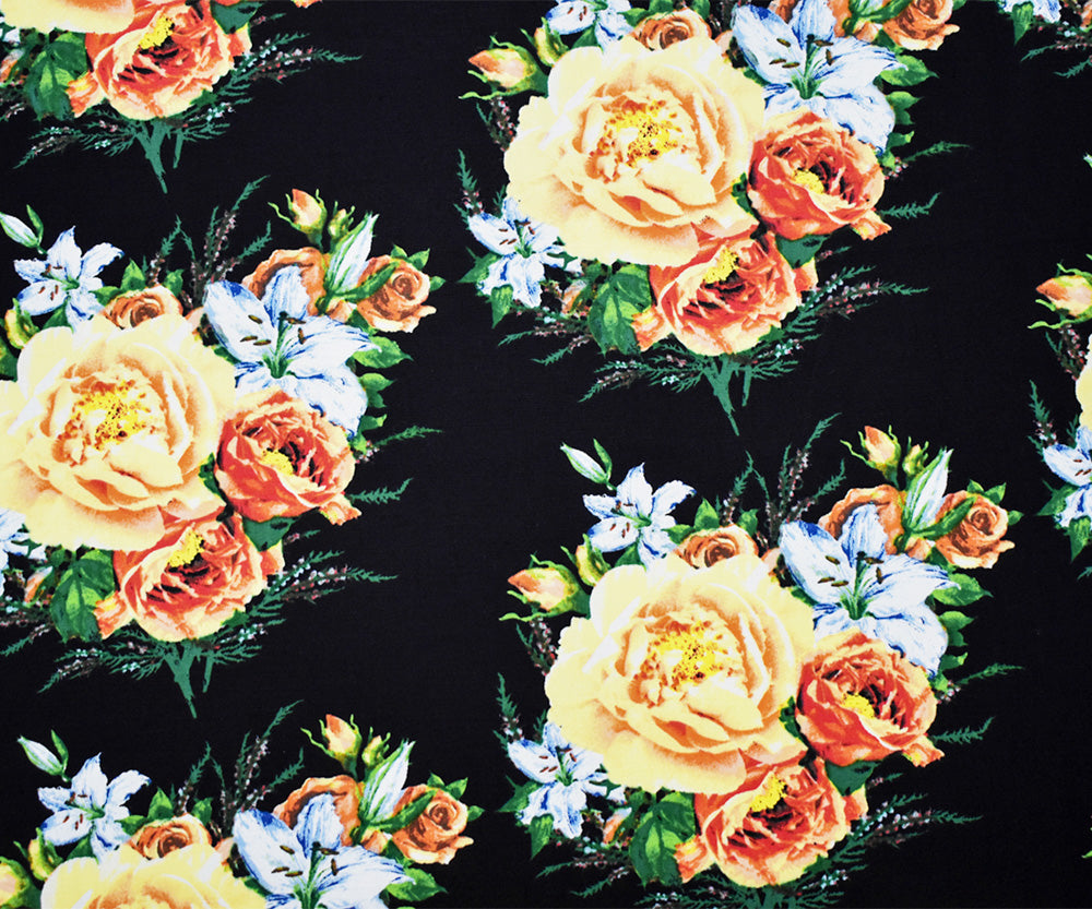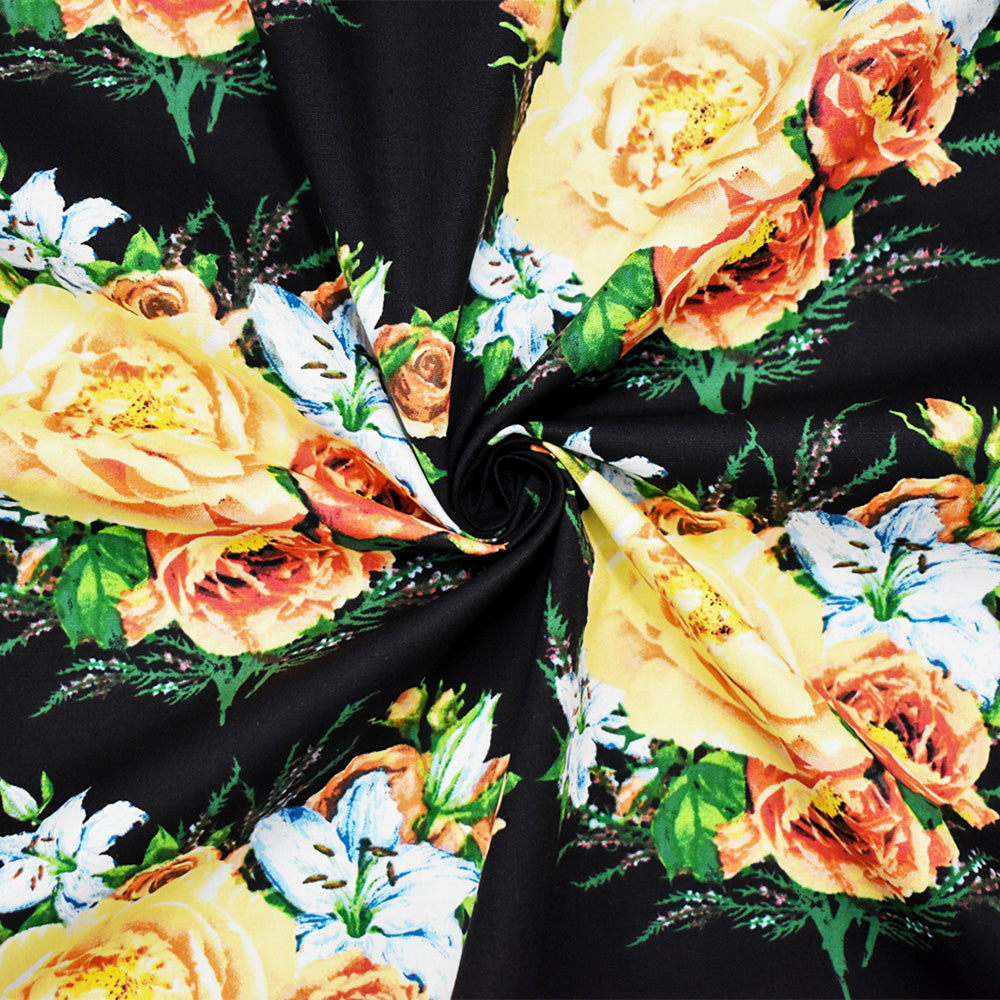 Black-Yellow-Multi Cotton Floral Printed Stretch Spandex Woven Fabric