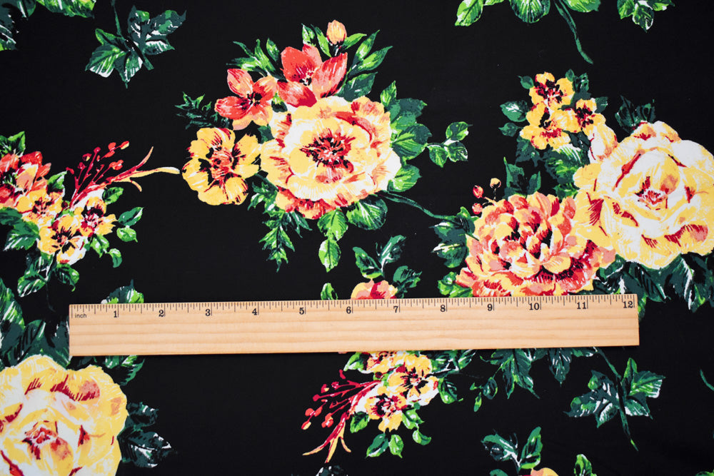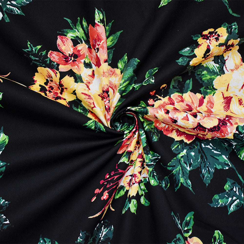 Black-Yellow-Multi Cotton Stretch Spandex Floral Printed Poplin Woven Fabric