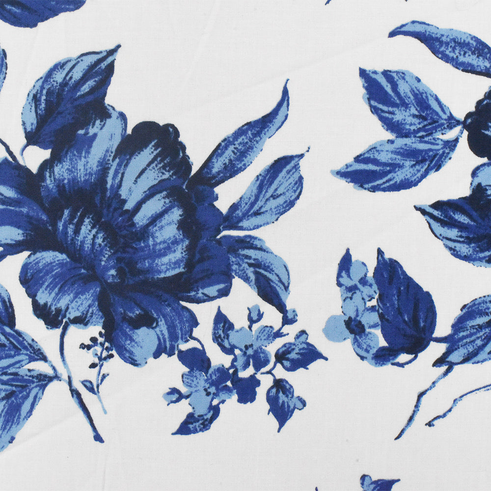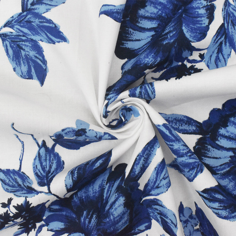 Blue-White-Multi Floral Border Printed Stretch Cotton Poplin Woven Fabric