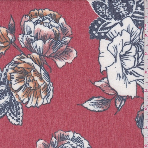 Brick/Navy Stylized Floral Double Brushed French Terry Knit Fabric