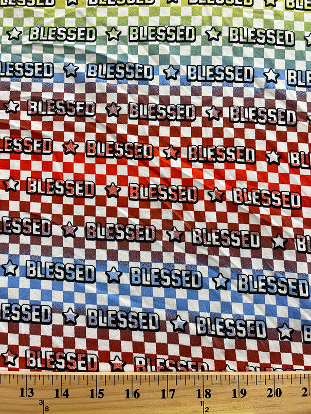 -White, Black, Red, Orange, Blue, Yellow, & Brown Checkered, Star, & Blessed Print Double Brushed Jersey Knit Fabric