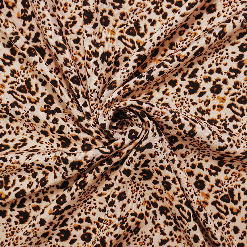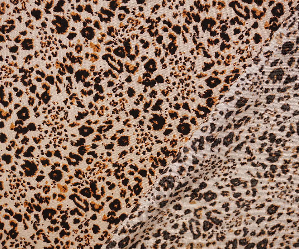 -This rayon fabric presents a leopard print on a soft, lightweight challis weave. The fluid drape and bold pattern make it ideal for fashionable blouses and dramatic scarves.
