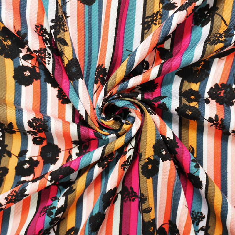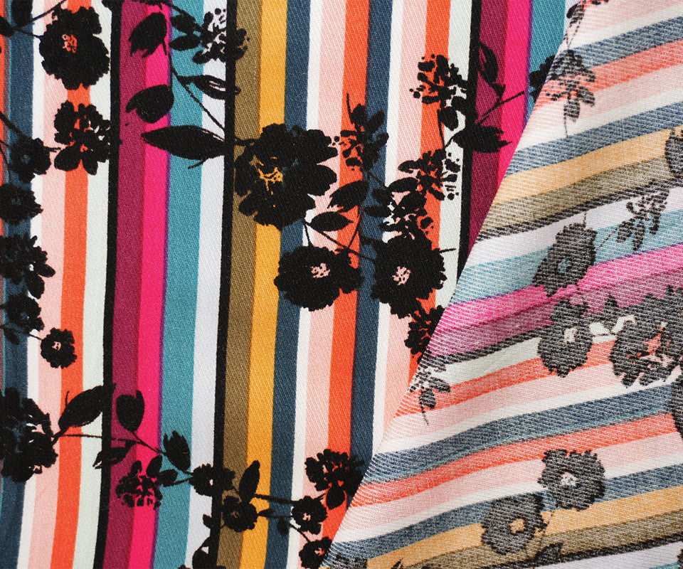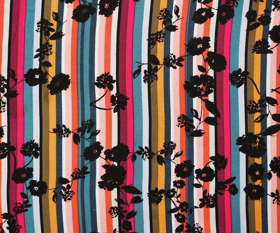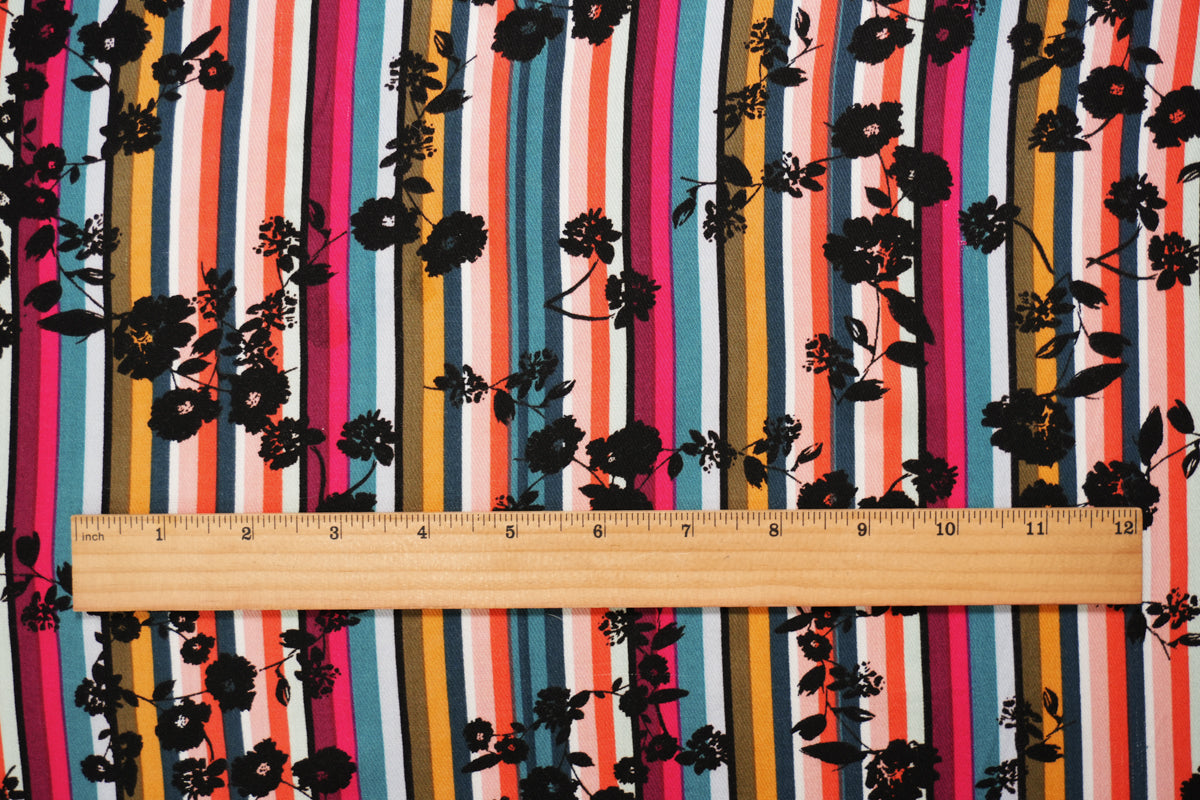 Black-Pink-Multi Rayon Floral Stripe Printed Twill Woven Fabric