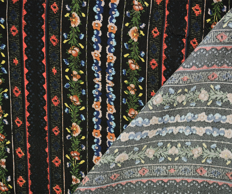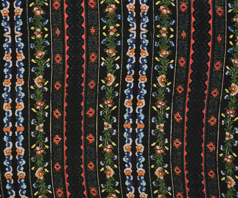 Black-Red-Multi Rayon Floral Stripe Printed Crepe Faille Woven Fabric