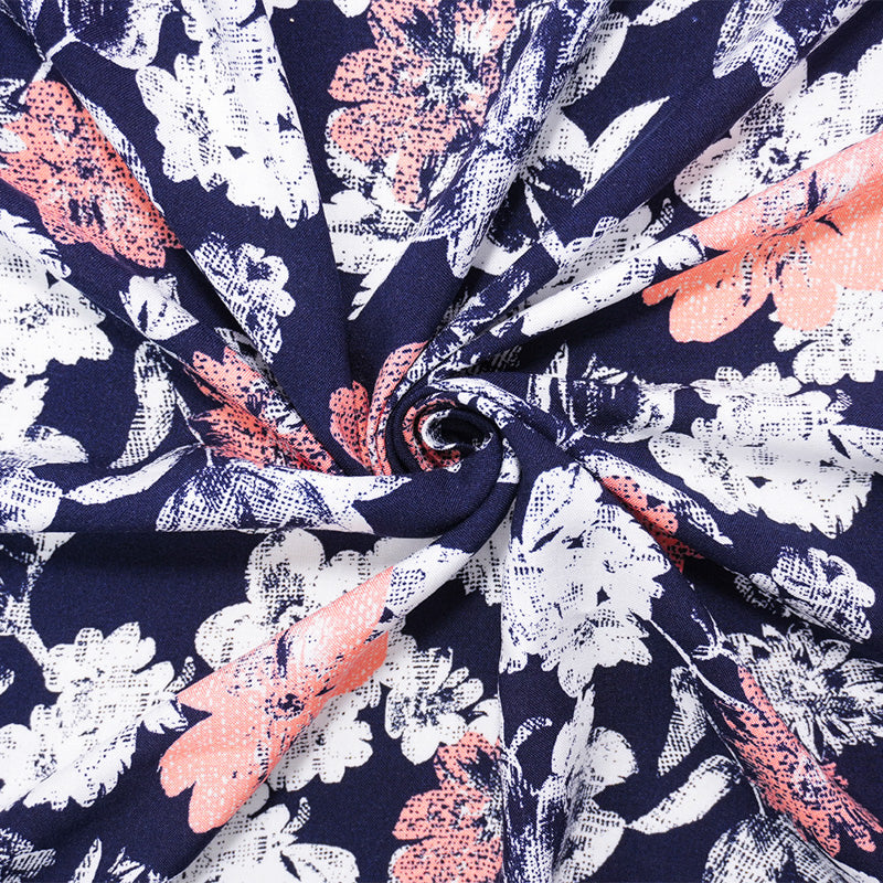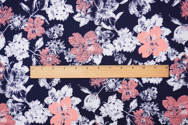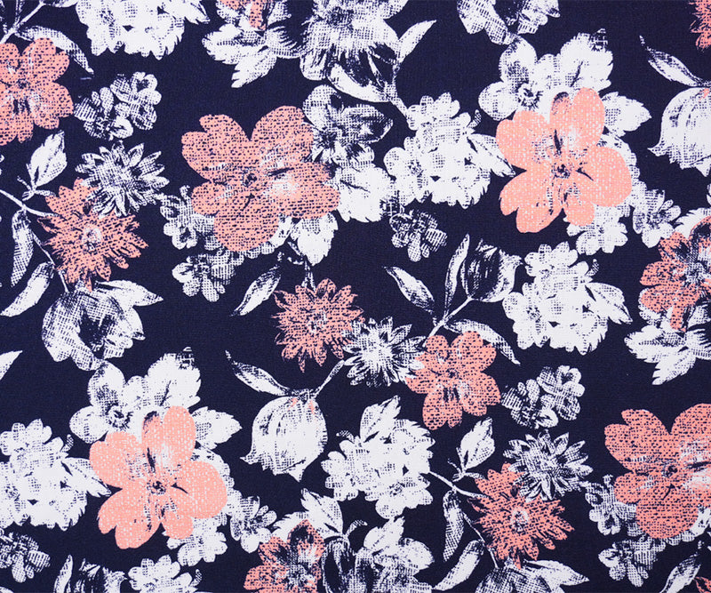 Deep Blue-White-Orange Rayon Floral Printed Challis Woven Fabric