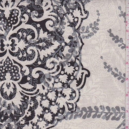 Oatmeal Grey Baroque Scroll Print Linen Canvas Fabric