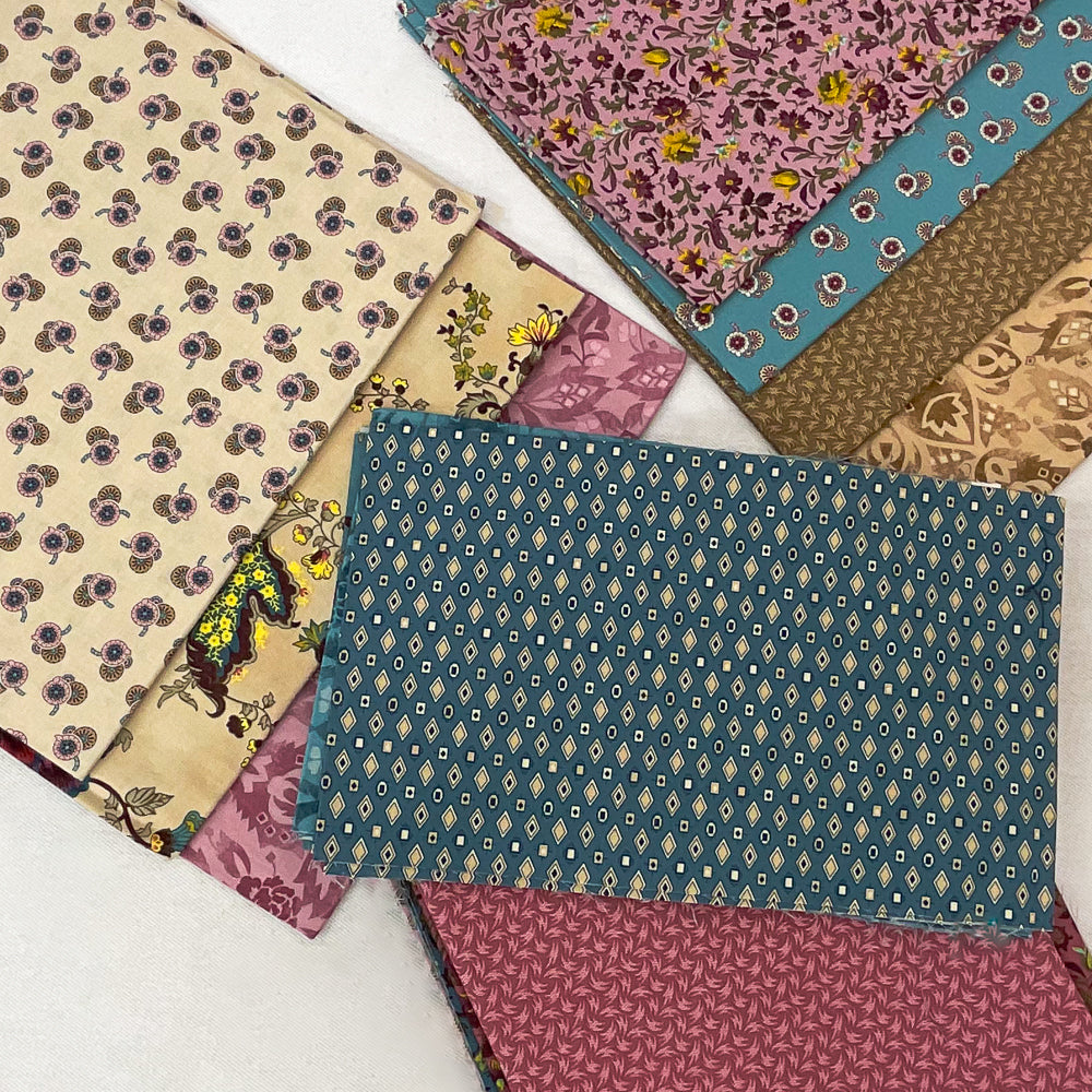 - Bundle fabrics include: 1 1/2 yard beige multi floral, 1/2 yard beige multi mini floral, 1/2 yard tonal beige brown floral batik, 1/2 yard brown beige abstract, 3/8 yard deep teal brown floral, 1/2 yard teal yellow multi mini floral, 3/8 yard teal blue floral batik, 1/4 yard purple green on blue floral vine, 3/8 yard teal beige diamond, 1 yard deep blue teal abstract mini, 1/4 yard mauve pink teal mini floral, 1/4 yard mauve pink teal mini diamond, 3/8 yard pink purple floral batik, 3/8 yard mauve pink yellow floral leaf, 3/4 yard deep red green floral leaf, 1 1/8 yards pink red abstract mini. Pattern is not included.