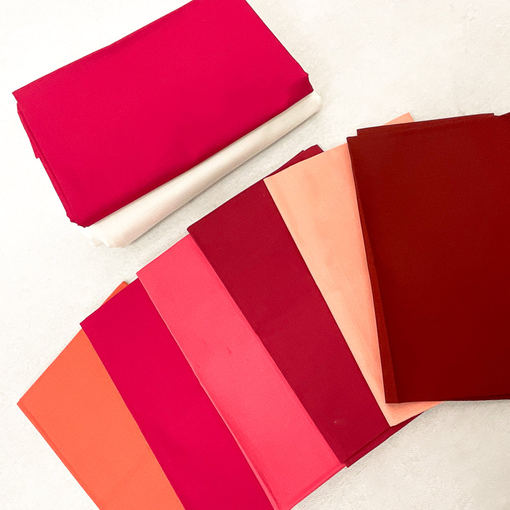 - Bundle fabrics include: 3/4 yard hot pink solid, 1 fat quarter hot pink solid, 1 fat quarter peach solid, 1 fat quarter red solid, 1 fat quarter deep red solid, 1 fat quarter orange solid, 1 fat quarter pink solid, 3 1/2 yards white solid. Pattern is not included.
