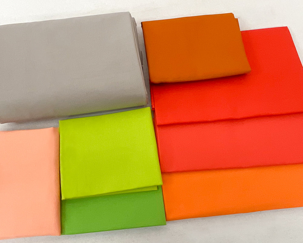 - Bundle fabrics include: 1/2 yard peach solid, 1/2 yard antique orange solid, 1/2 yard pumpkin orange solid, 1/2 yard red orange solid, 1/4 yard lime green solid, 1/4 yard apple green solid, 1/2 yard apricot red orange solid, 3 7/8 yards gray solid. Pattern is not included.