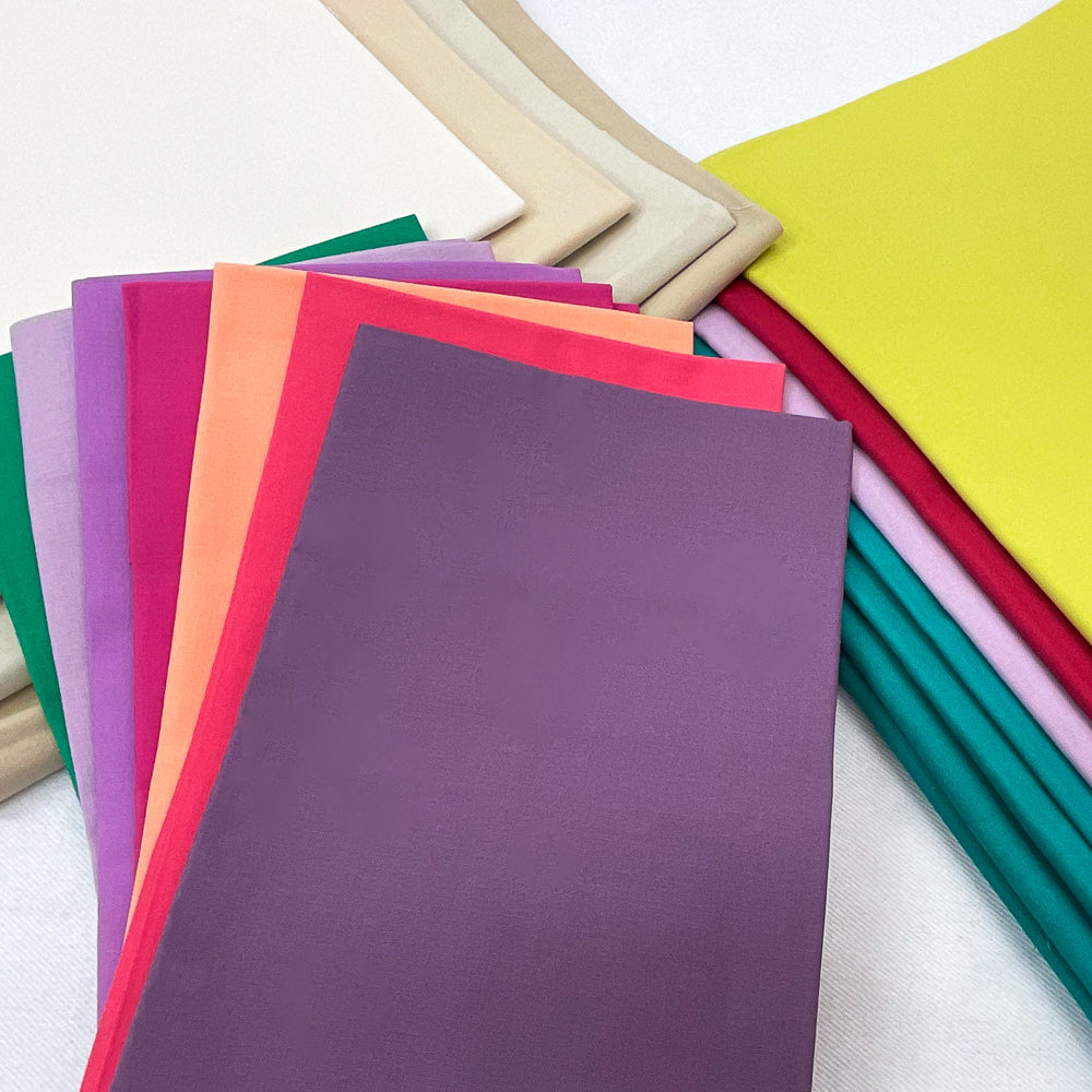 - Bundle fabrics include: 5/8 yd green solid, 5/8 yd light purple solid, 5/8 yd red solid, 1/4 yd deep pink solid, 1/4 yd cream orange solid, 1/4 yd pink solid, 1/2 yd purple solid, 1/2 yd dark purple solid, 3/8 yd dusty light purple solid, 1/2 yd emerald green solid, 3/4 yd chartreuse solid, 3/4 yd teal green solid, 1 yd light cream beige solid, 1 yd beige solid, 1 yd beige dusty solid, 3/4 yd cream beige brown solid, 2 yds green solid. Pattern is not included