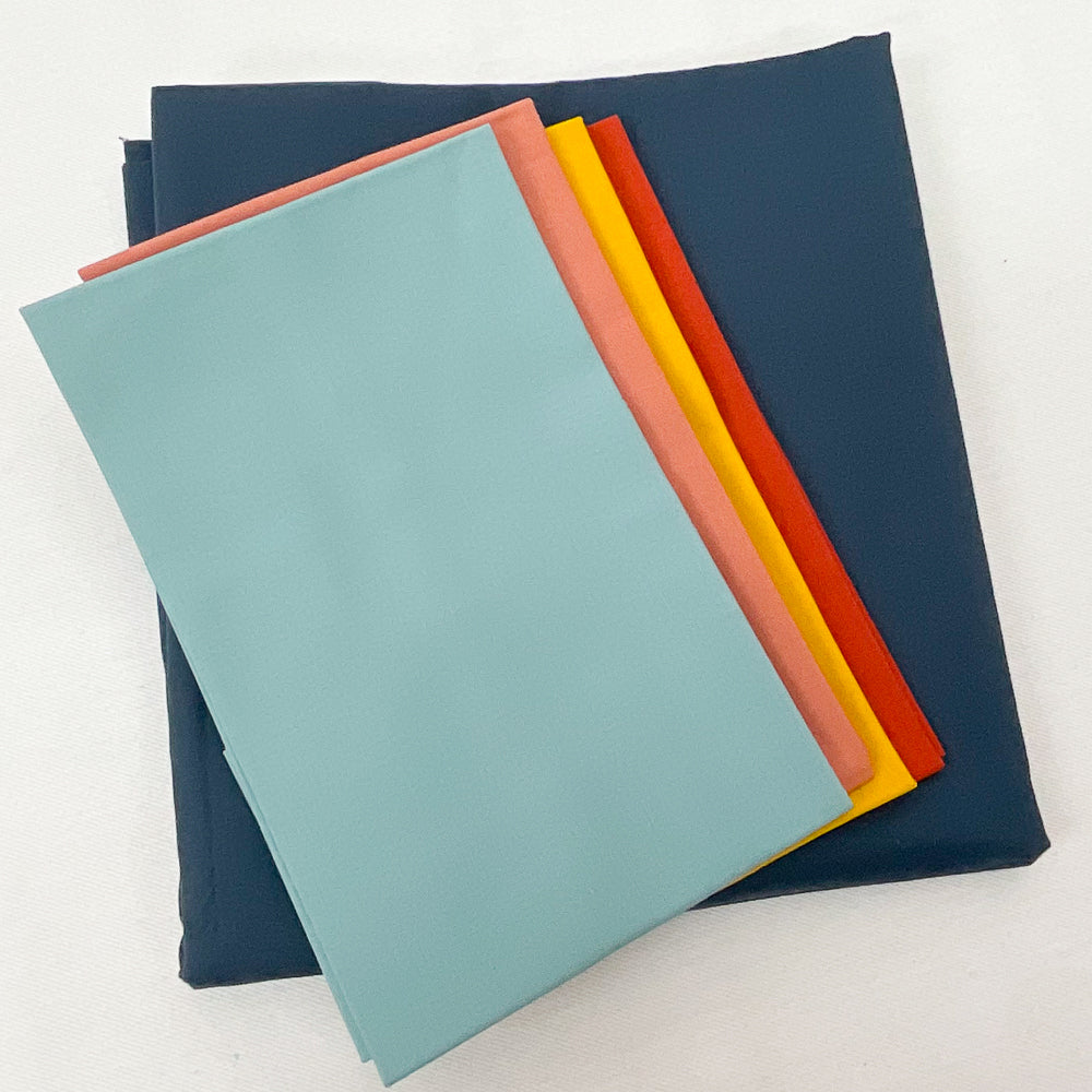 - Bundle fabrics include: 1/4 yd solid coral, 1/4 yd solid teal, 1/4 yd solid mustard, 1/4 yd solid red, 2 1/4 yd solid blue. Pattern is not included