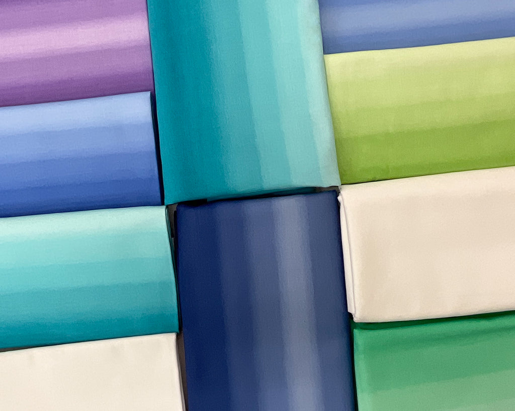 - Bundle fabrics include: 1 3/8 mint green ombre, 5 yards off white solid, 1/2 yd same off white solid, 1 yd water blue ombre, 3/4 yd pear green ombre, 3/4 yd teal ombre, 1 yd purple ombre, 1 yd blue ombre, 2 1/8 yd teal ombre, 2 yds deep blue ombre, 1 3/8 yd same deep blue ombre. Pattern is not included