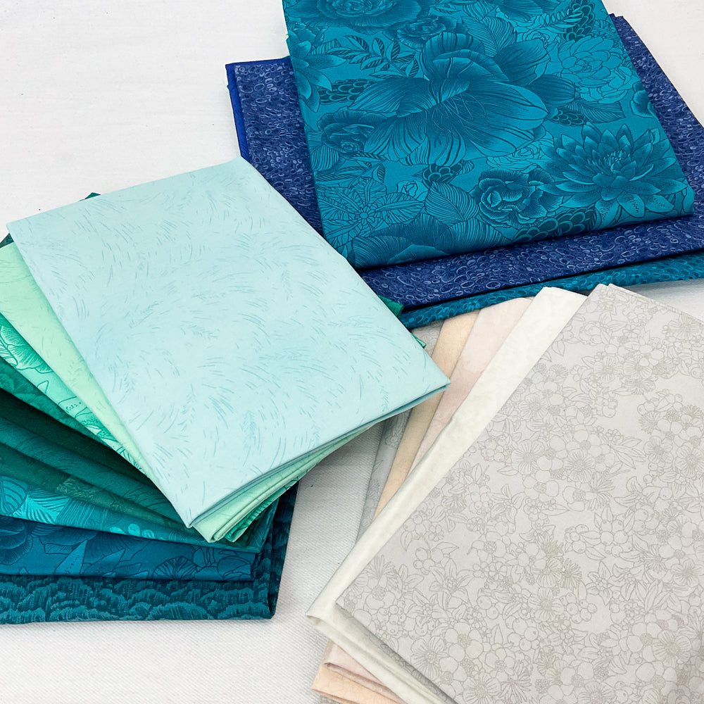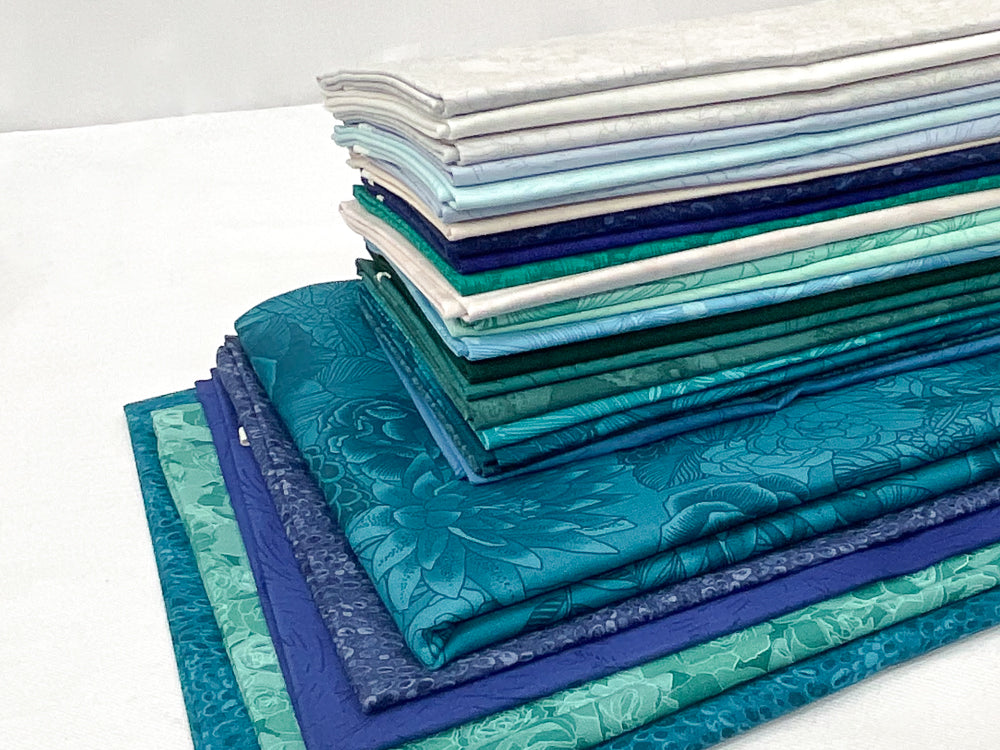 - Bundle fabrics include: 5/8 yd green roses, 1/2 yd gray roses, 1/2 yd white/gray clouds, 1/2 yd gray flowers, 1/2 yd blue abstract, 1/2 yd teal abstract, 1/2 yd blue abstract, 1/2 yd beige abstract, 1/2 yd dark blue abstract circle, 1/2 yd blue tonal floral, 1/2 yd green tonal clouds, 1/2 yd beige tonal marble, 1/2 yd green floral, 1/2 yd light green abstract, 1/2 yd blue leaf, 1/2 yd green black floral, 1/2 yd green dark abstract, 1/2 yd tonal green marble, 1/2 yd teal dark leaf, 1/2 yd deep teal floral, 1/2 yd teal tonal clouds, 1/2 yd blue abstract tonal, 5/8 yd teal pebble, 5/8 yd blue on blue scribble, 5/8 yd deep blue pebble, 2 yds green floral. Pattern is not included