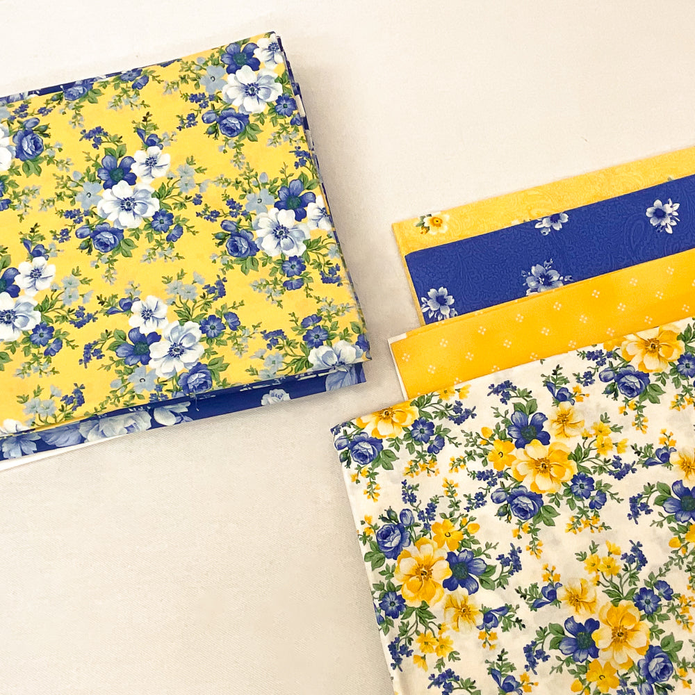 - Bundle fabrics include: 5/8 yard yellow paisley floral print, 3/8 yard white yellow blue floral print, 5/8 yard denim blue white floral print, 1 1/4 yards denim blue paisley floral print, 1 1/4 yards chambray blue white dot print, 1 1/4 yards denim blue arched print, 2 1/4 yards yards yellow blue floral, 2 3/8 yards chambray arch print, 3 3/4 yards white solid. Pattern is not included.