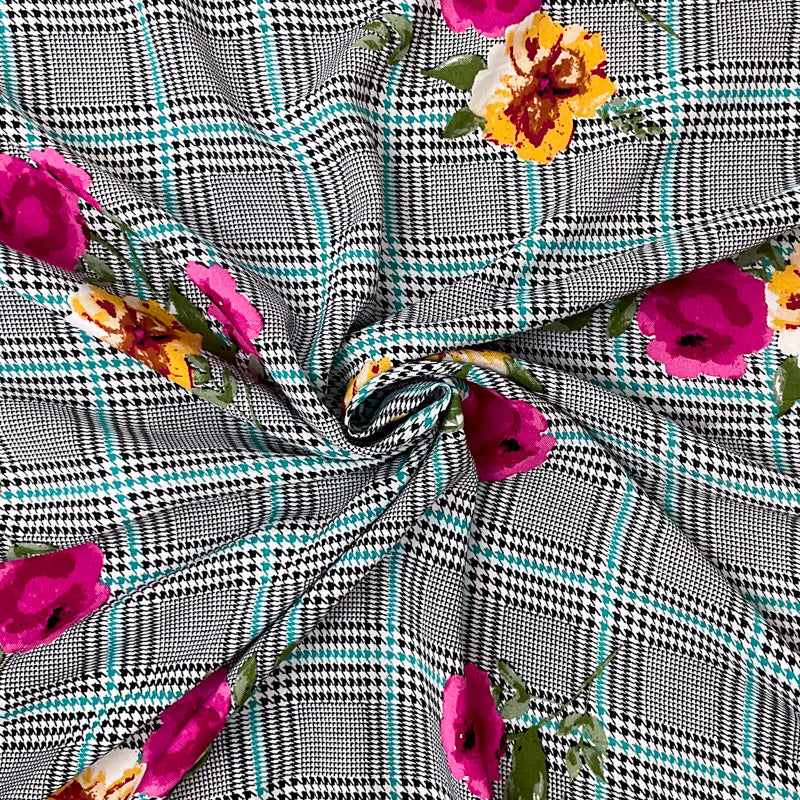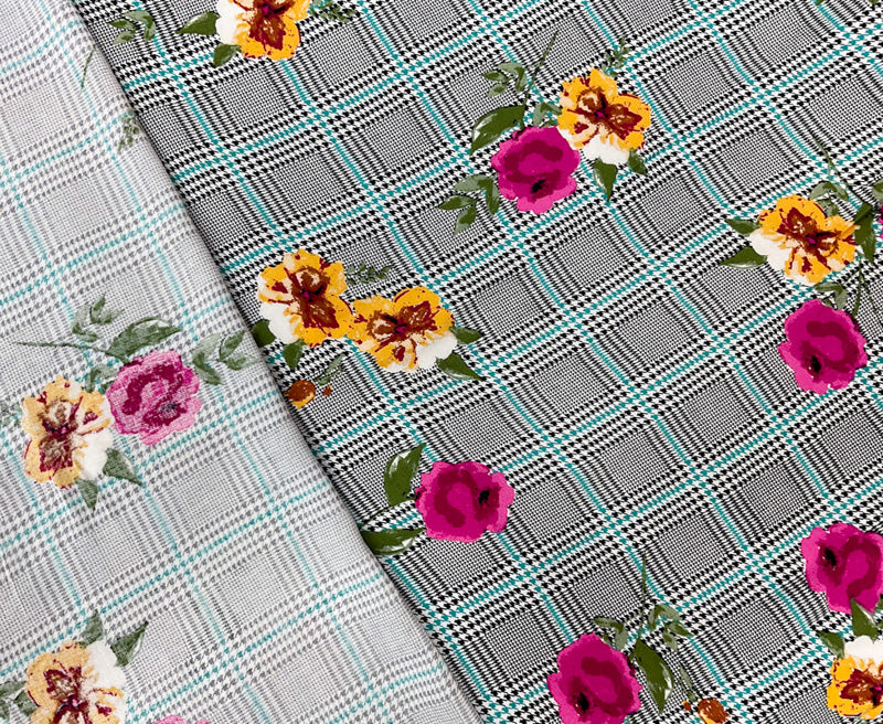 -This rayon fabric features a unique printed design combining floral and plaid motifs on a lightweight challis weave. The soft, fluid drape of the construction makes it ideal for blouses, scarves, and flowing dresses.
