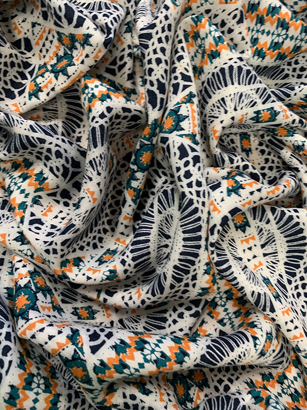 Blue and Gold Lace Look Print Rayon Challis Fabric