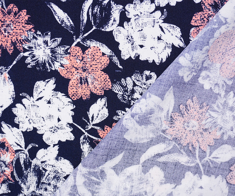 Deep Blue-White-Orange Rayon Floral Printed Challis Woven Fabric