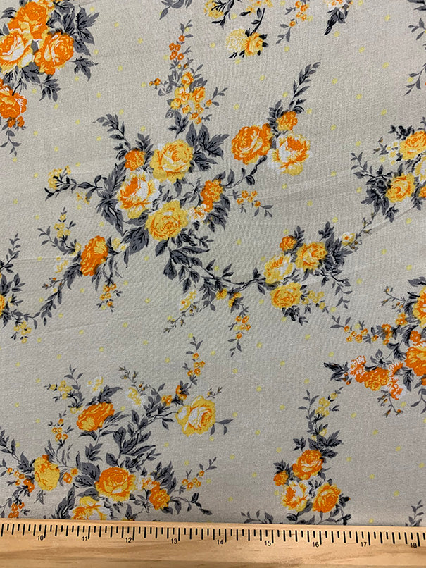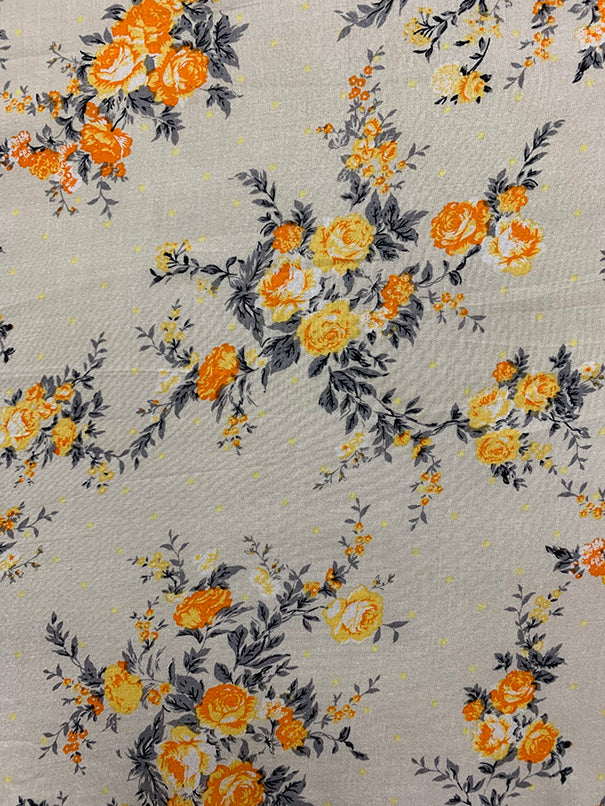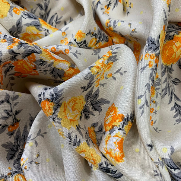2 YD PC -Orange, Yellow, Gray, Black Rose Print on Ivory Rayon Challis Fabric
