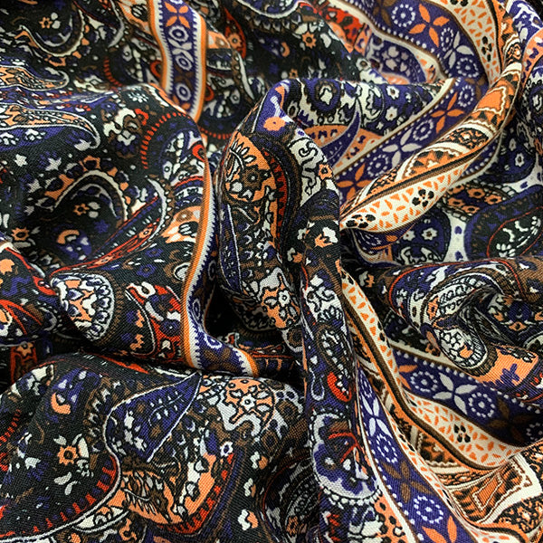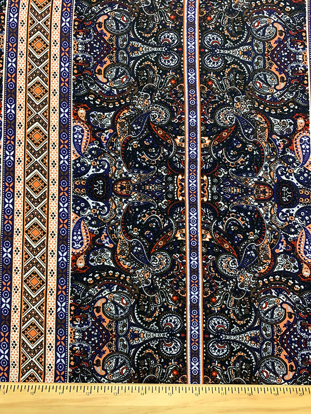 -Peach, Black, Red, White, & Brown Multi Stripe Print Rayon Challis Fabric