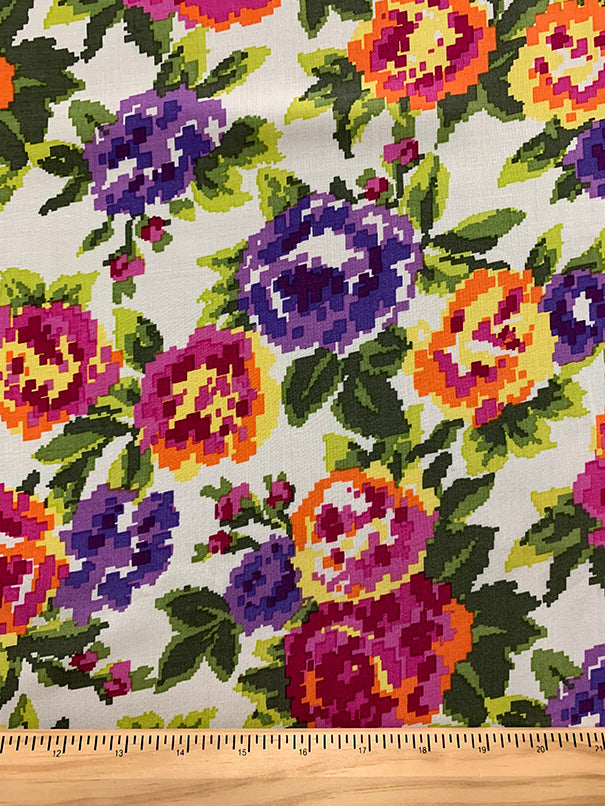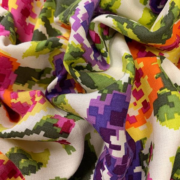 -Purple, Green, Red, Coral, & Magenta Pixelized Floral Print on White Rayon Challis Fabric