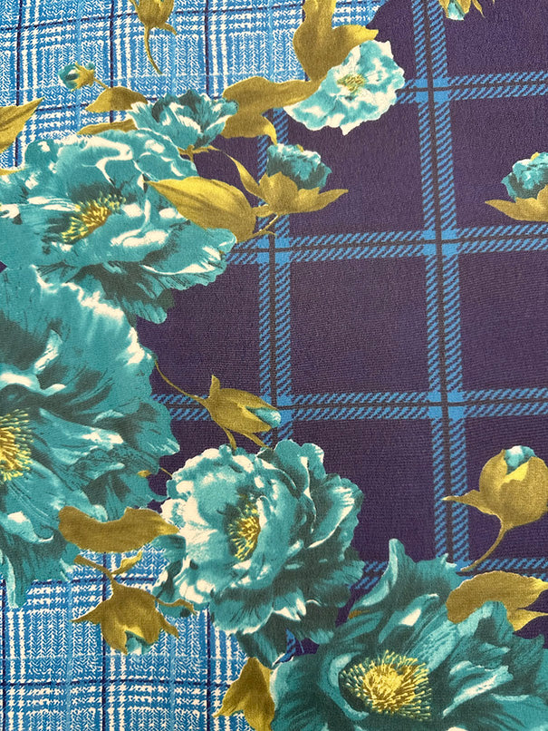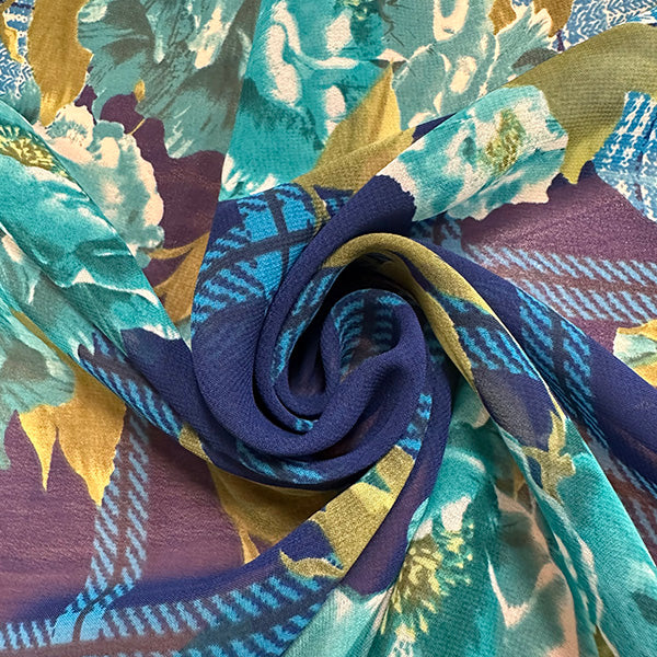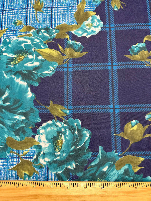 4 YD PC-Blue Plaid Floral Print Poly Chiffon Fabric