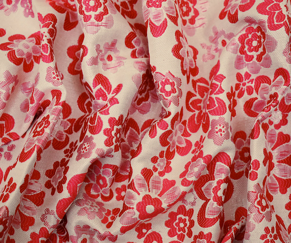 Pink-Silver-Beige Polyester Blend Metallic Floral Jacquard Brocade Woven Fabric