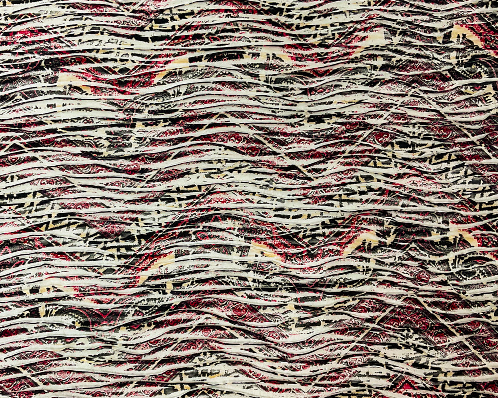 -A unique blend of red, beige, and multi Aztec-inspired chevron print creates a dynamic pattern, complemented by the fabric's pleated texture.