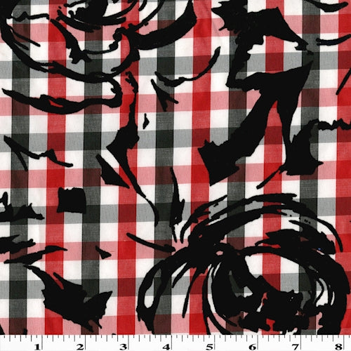 Red/White/Black Velvet Flocked Flower Print Gingham Shirting Fabric