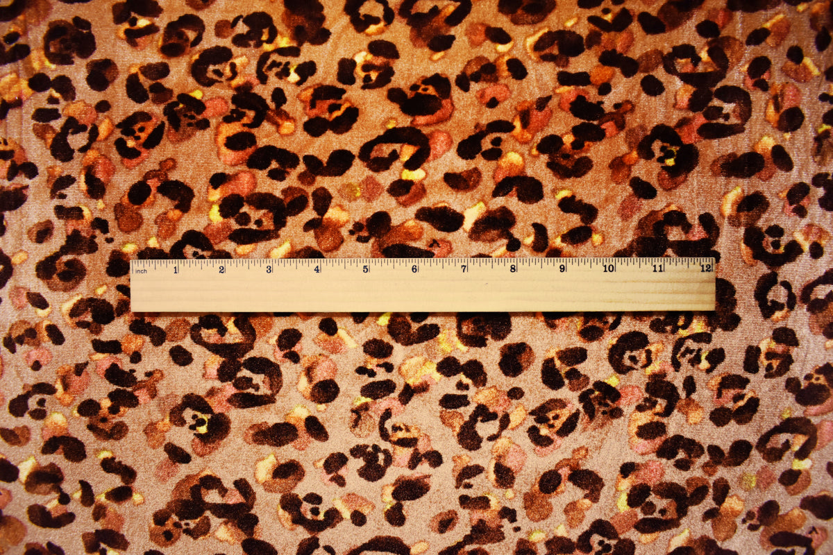 -Plush velvet knit fabric with a leopard inspired print pattern. The poly-spandex blend provides excellent stretch and recovery for form-fitting designs. Its soft, dense pile offers a luxurious hand feel and rich texture, ideal for statement garments.