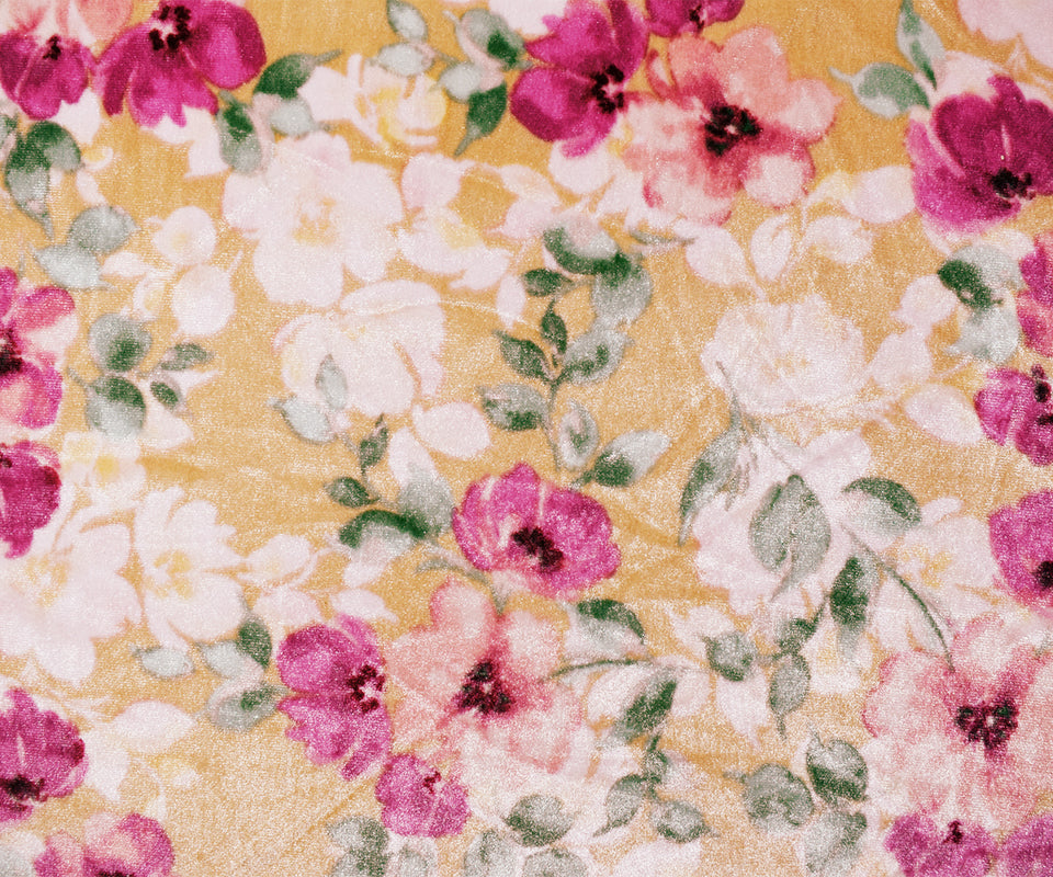 -Luxurious velvet knit fabric featuring a floral print with stretch properties. The poly-spandex blend offers both comfort and durability with excellent recovery. Perfect for creating elegant apparel with a soft texture and beautiful drape.
