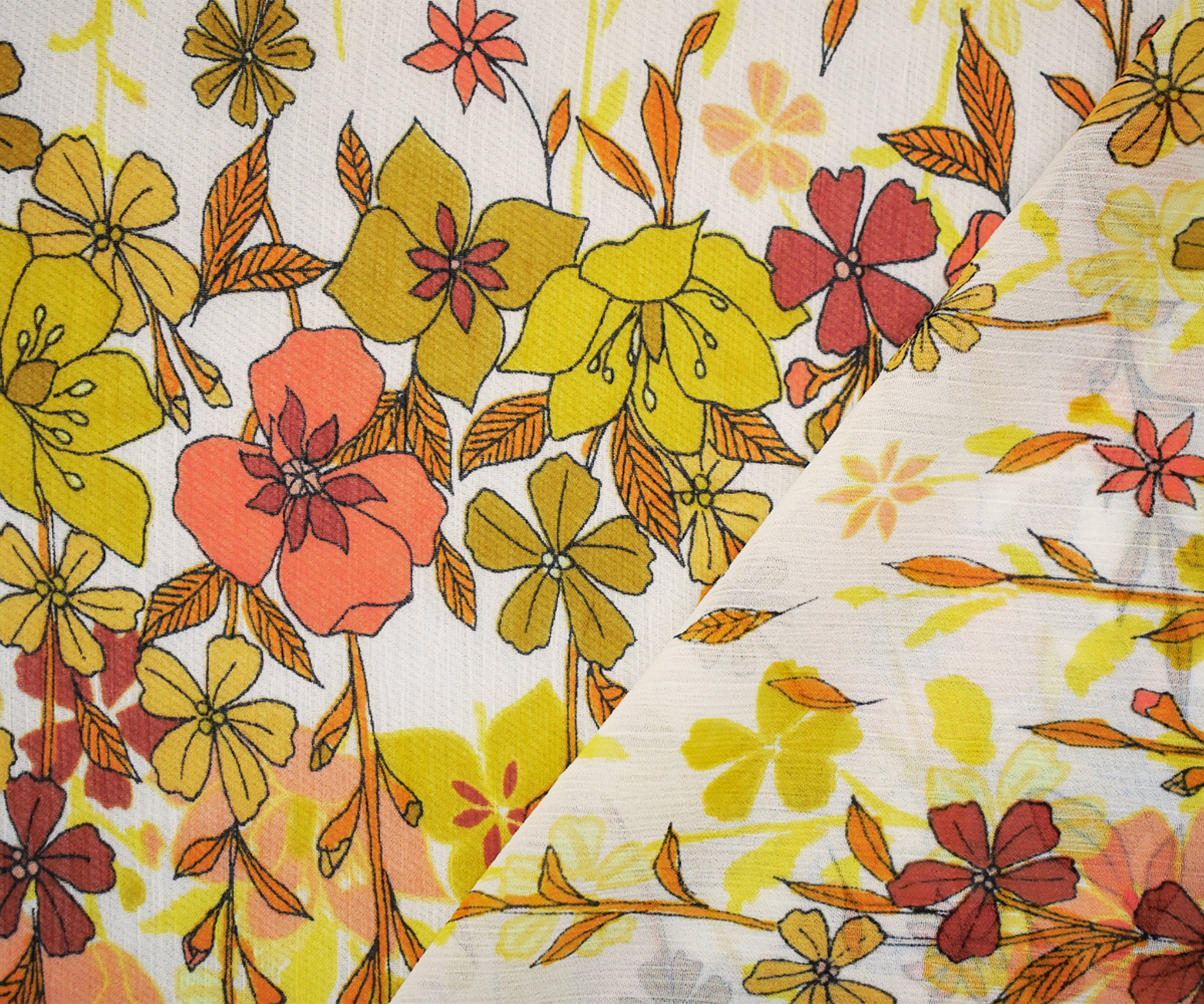 Mustard-Orange-Multi Poly Floral Printed Crinkled Yoryu Chiffon Woven Fabric