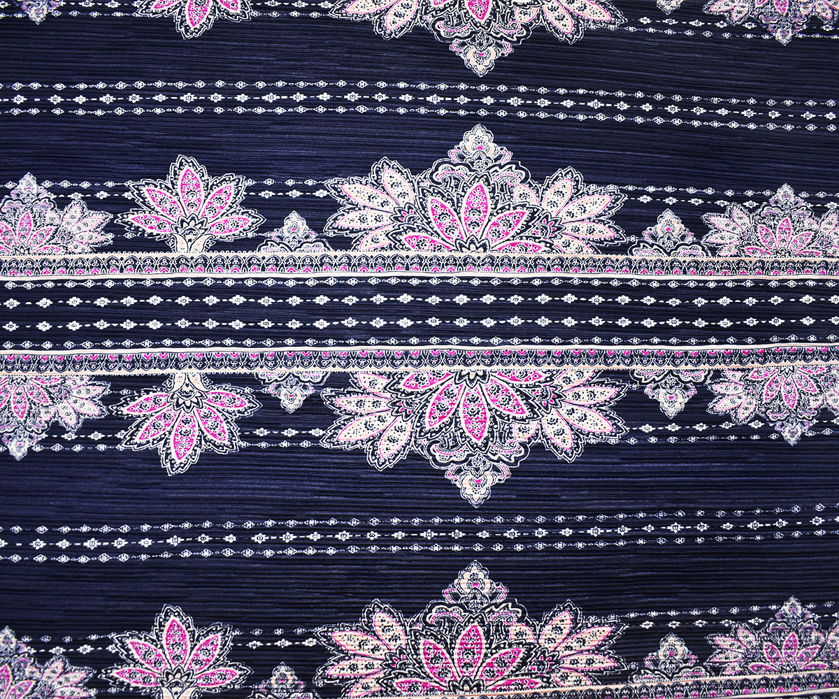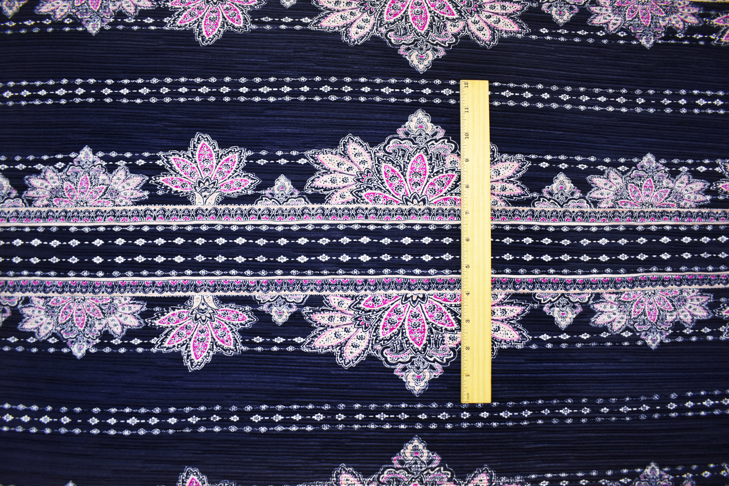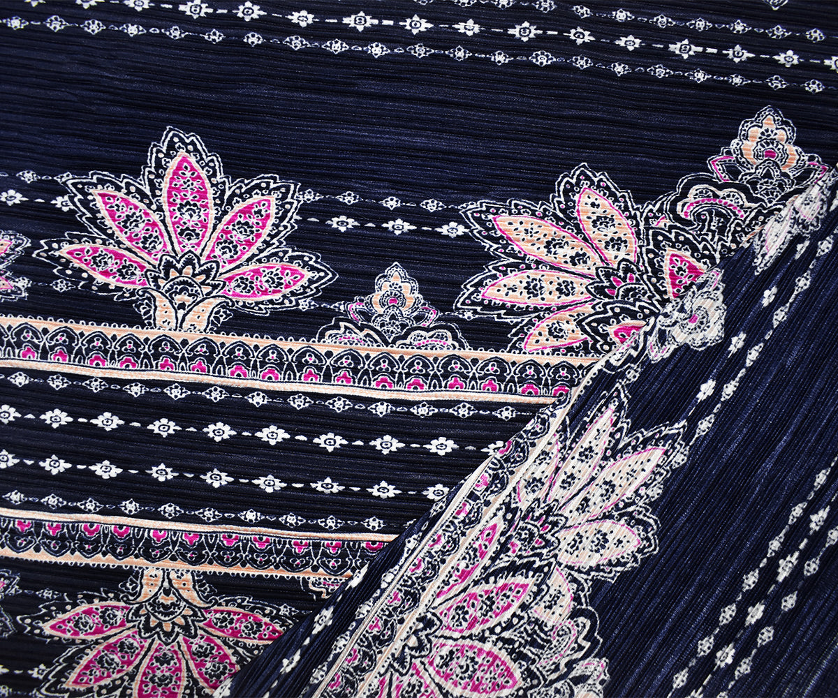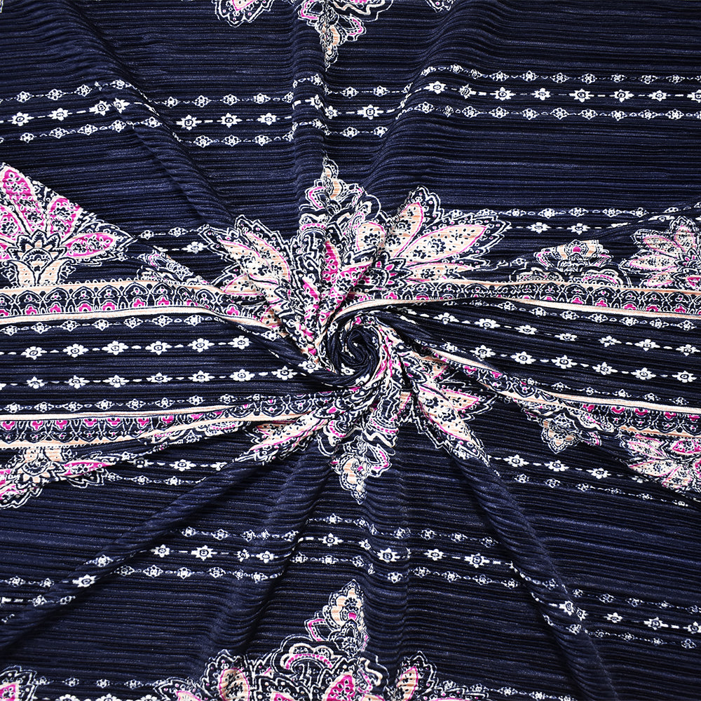 Blue-Multi Poly Stretch Baroque Floral Print Pleated Interlock Knit Fabric