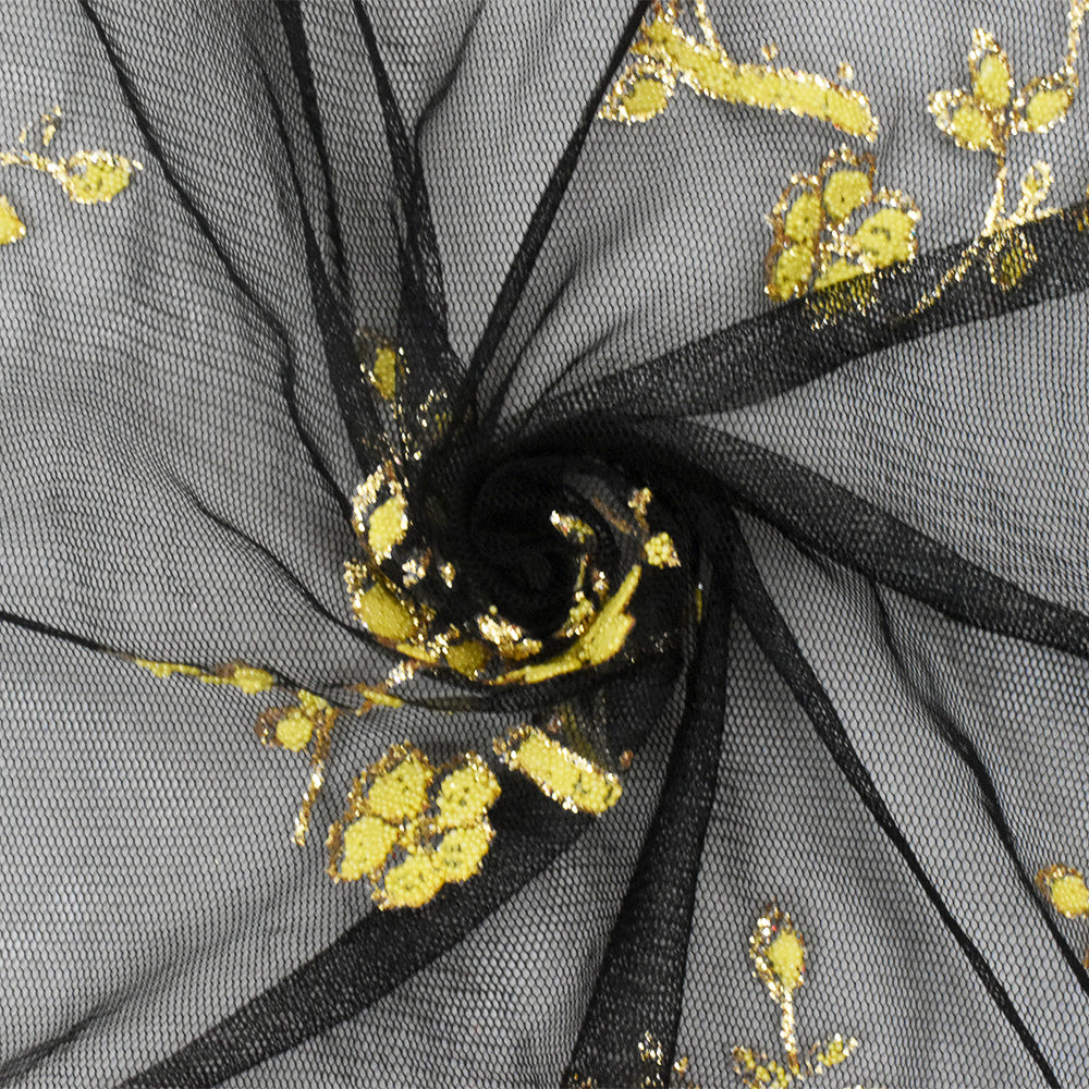Star Gold-Black-Yellow Flora Sparkles and Bead Poly Mesh Knit Fabric