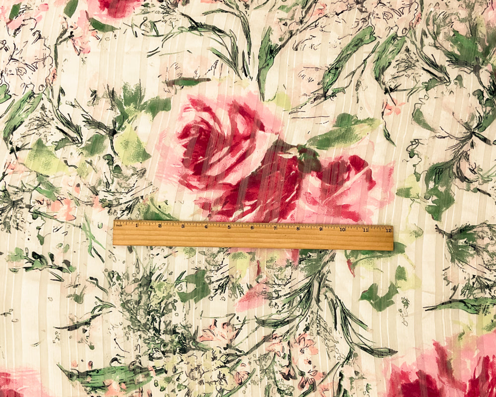 White-Multi Poly Floral Print Stripe Satin Chiffon Woven Fabric