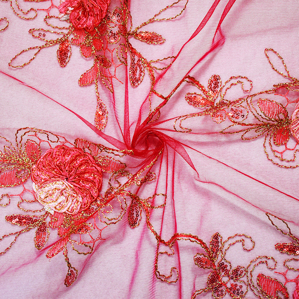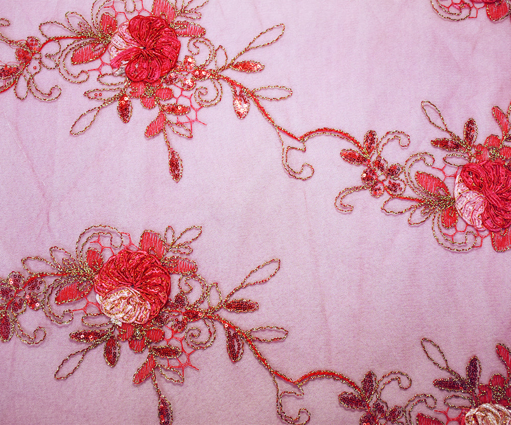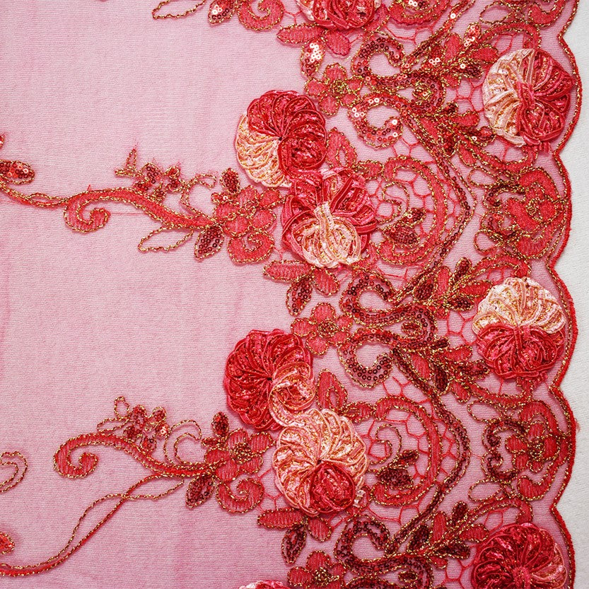 Deep Red-Gold Nylon Embroidery Applique-Sequin Floral Vine Scallop Tulle Fabric