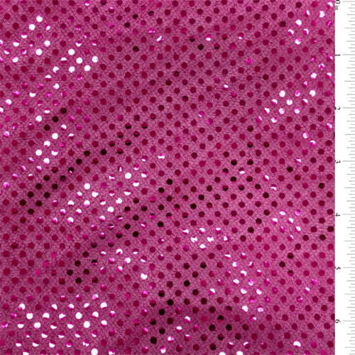 Metallic Fuschia PinkKnit FabricWith MetallicFuschia Pink SequinsSuitable for Blouses,Dresses, & Dancewear80% Nylon20% Metallic43"-44" WideDry Clean