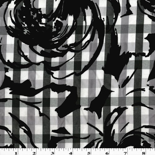Black/Multi Velvet Flocked Floral Print Gingham Shirting Fabric