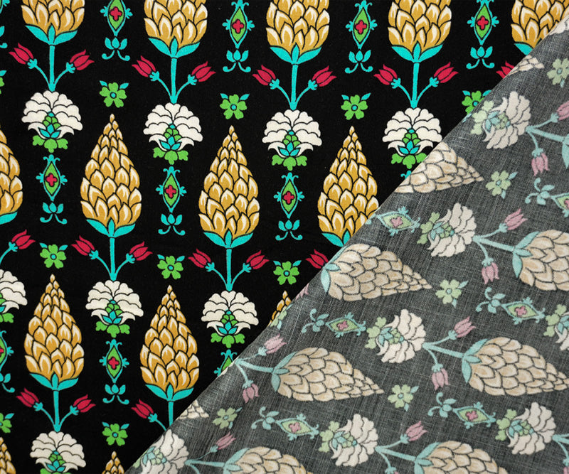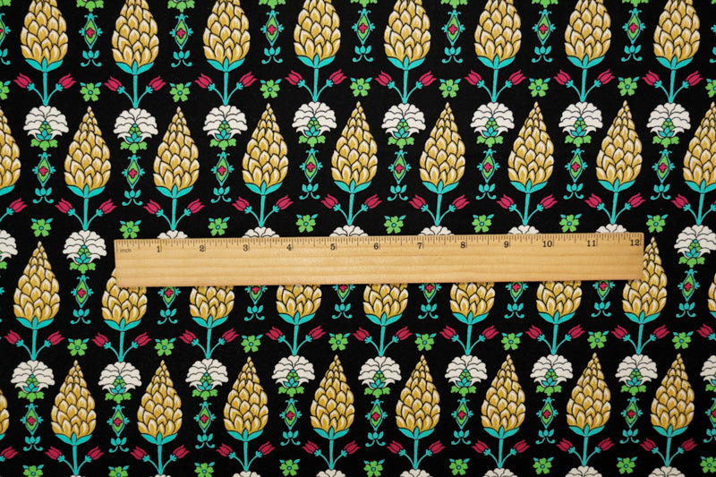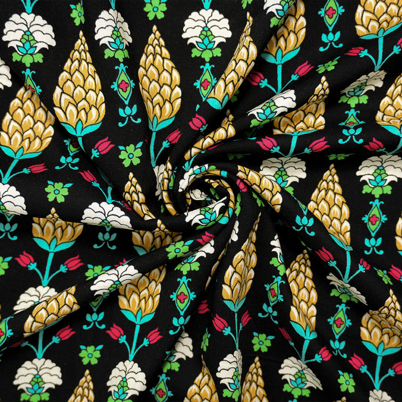 Black-Yellow-Multi Rayon Hops Floral Printed Challis Woven Fabric