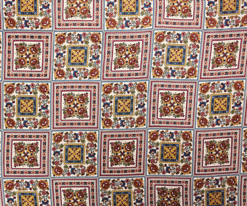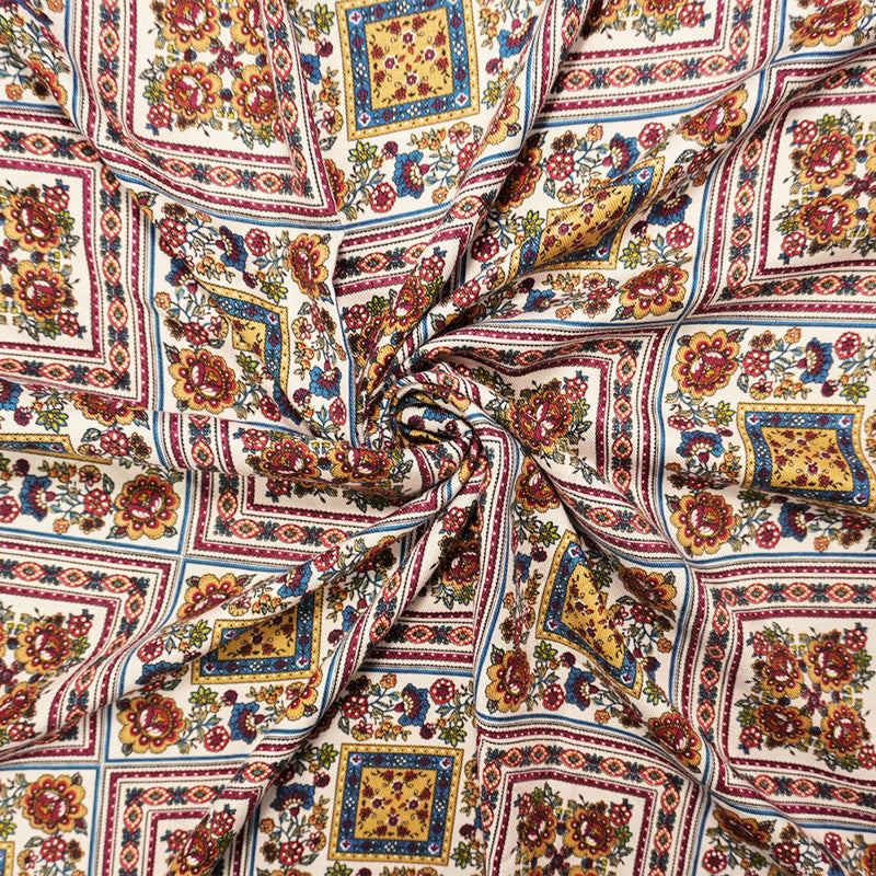 Ivory-Red-Multi Rayon Floral Tile Printed Twill Woven Fabric