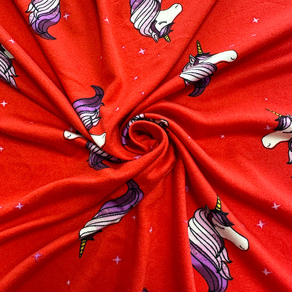 Red and White Star Unicorn Printed Double Brushed Jersey Knit Fabric