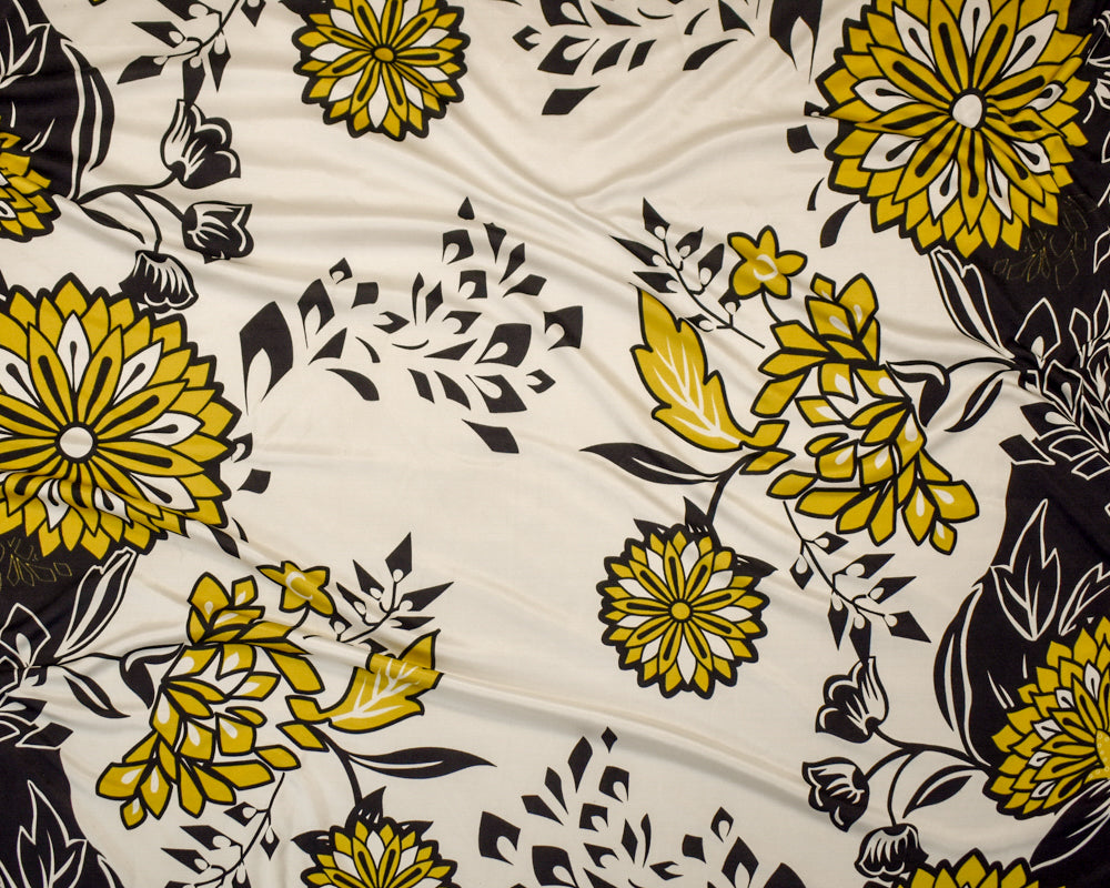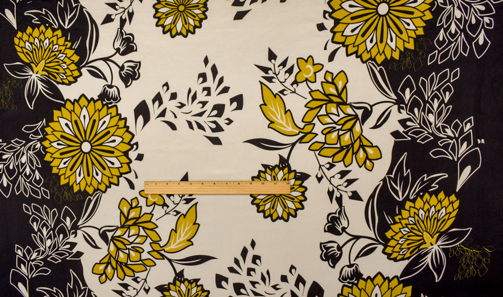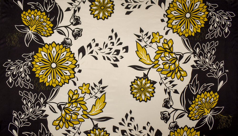 Black-Dijon-White Floral Border Printed Stretch Silk Jersey Knit Fabric