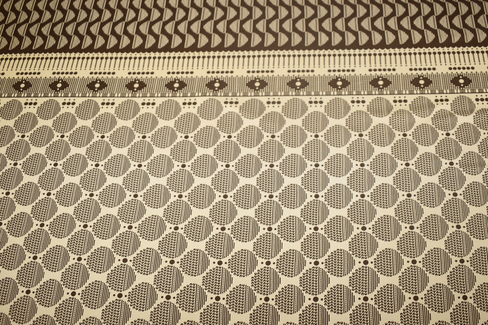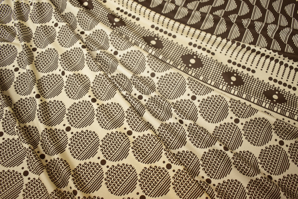 -100% silk jersey knit fabric printed with a multi dotted pattern, scalloped elements in a striped arrangement. Line if needed.