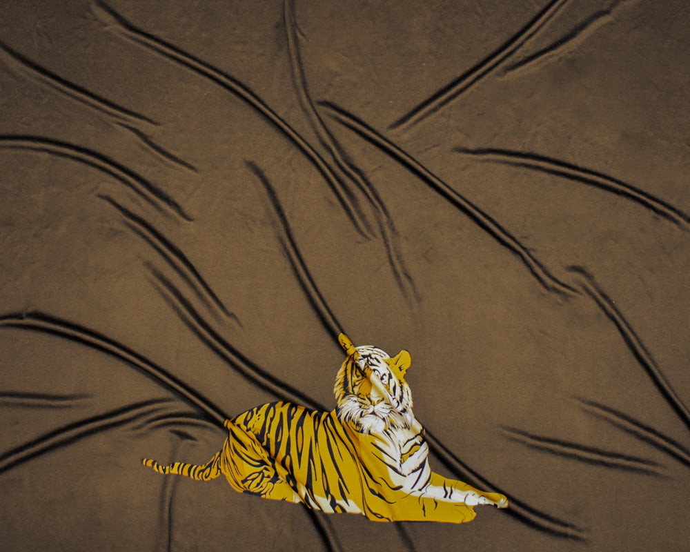 Brown-Yellow-Multi Tiger Motif Panel Printed Stretch Silk Jersey Knit Fabric