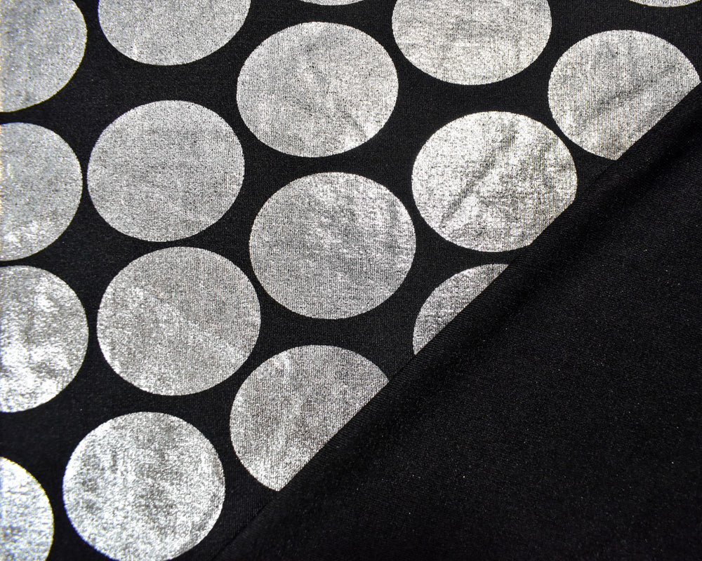 Silver-Black Poly Blend Spandex Foil Dot Printed Slinky Knit Fabric